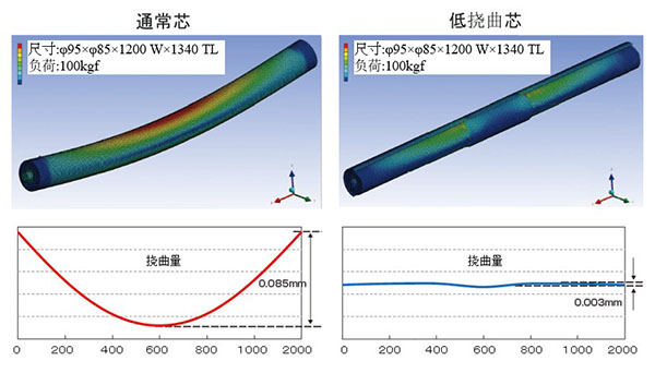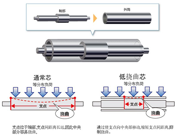 低挠曲胶辊是由外筒和内筒构成的特殊双重管构造,通过外筒使轴部的支点从两端移动到中央部分,对胶辊施加均匀的压力,防止褶皱发生、空气卷入。